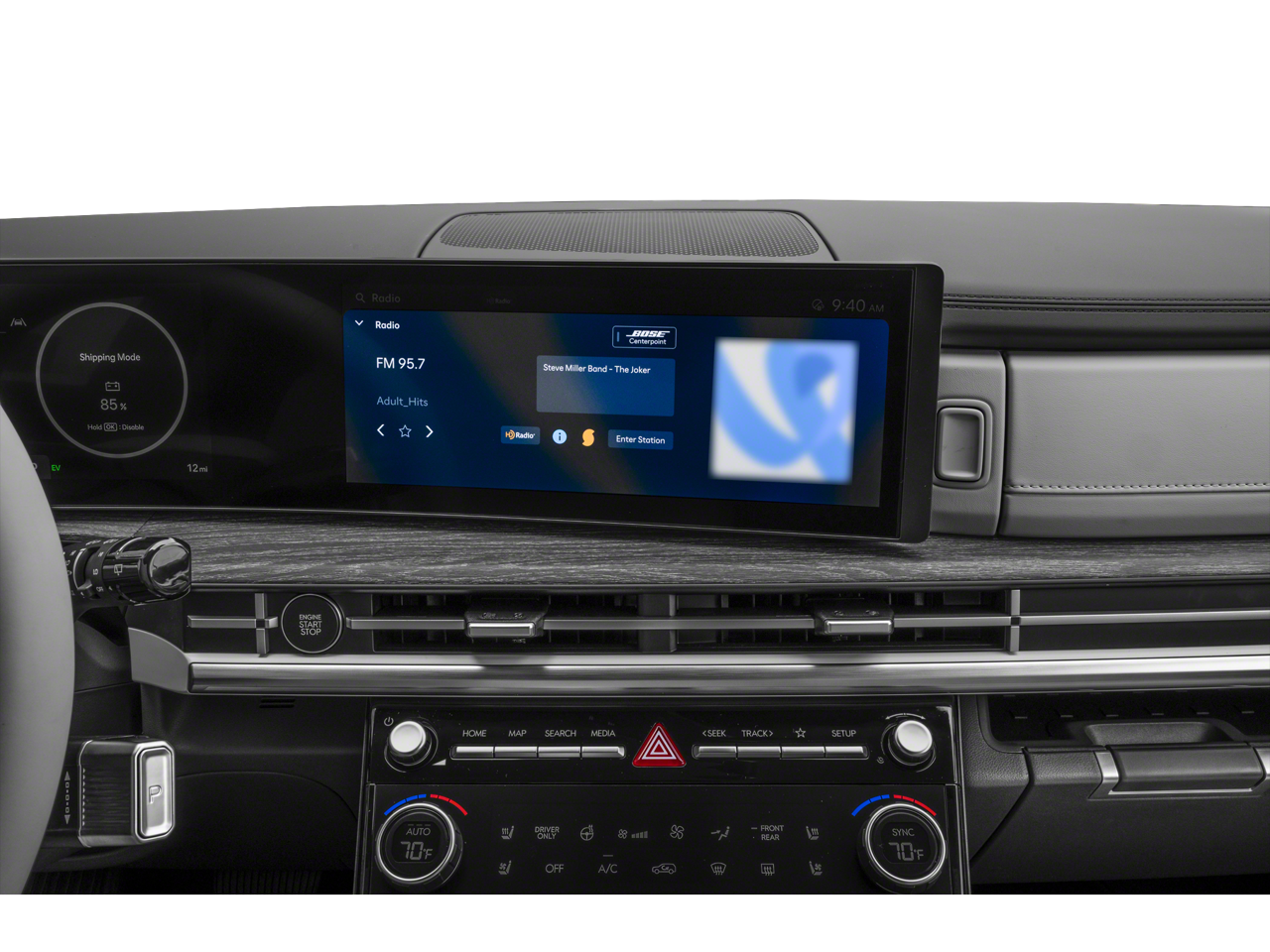 - Radio: AM/FM/HD Bose Premium Audio System -inc: 12 speakers including subwoofer, external amplifier, 12.3" wide touchscreen, Apple CarPlay and Android Auto, Bluetooth hands-free w/wireless audio streaming, dynamic voice recognition, USB connectivity, SiriusXM, wifi hotspot, Blue Link connected car system, navigation system including traffic flow w/incident data via HD Radio (HERE), OTA updates (map only) and rear seat quiet mode